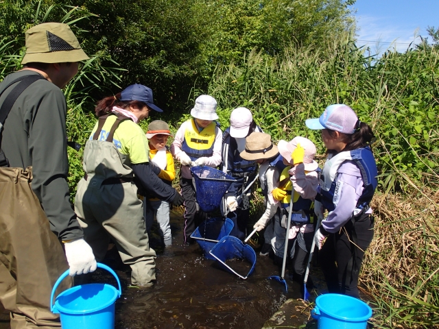 講師の先生に教えてもらいながら魚やエビ、水生昆虫等を網で捕まえて観察しました。また、罠を作って仕掛けてみると、アメリカザリガニを捕まえることができました。安春川の成り立ちや、外来種について学ぶことができました。