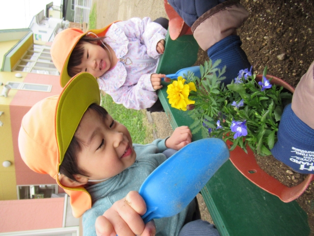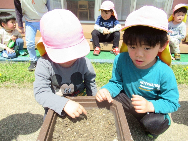 家庭で使った洗剤などのいろいろな容器を使い、水鉄砲に見立てて遊ぶ遊び方は、いつもの水鉄砲と違う楽しさがあったようです。友達と交換しながら、思い切り遊ぶ姿がかわいかったです。すぐ捨てるのではなく、遊びに使えるものを考えることも楽しいな、と思いました。
