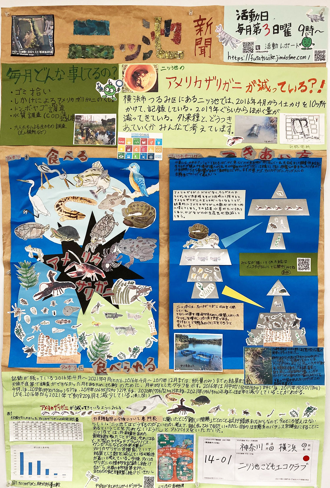 壁新聞のテーマ アメリカザリガニの現状をまとめ、二ツ池の今後について僕たちなりに考えました。生きものたちが「もっともっと住みやすく」なるようどうしたらよいのか考えていきたいです。二ツ池新聞のタイトルは、子ども達が二ツ池をイメージしてちぎり絵で作りました。古新聞から色を見つけだす所から、皆で楽しく頑張りました(^^)。新聞作り楽しかったです^^