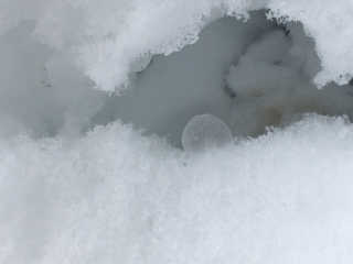 シャボン玉液は台所洗剤とぬるま湯を混ぜただけのものだったので、凍る様子は一箇所からじわじわとガラスが曇るようでした。全部が曇るとシワができふにゃふにゃになり、予想と違ってました。