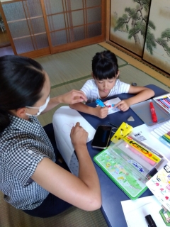 自分が描いた絵を切り抜いてマップ内のどこに貼るか探しながら貼っていきました。一緒にいた幼稚園生も一緒に参加しました。作っている中「この生き物も入れときたいね」などどんどん追加が出てきました。完成したマップを持ってみんな満足そうでした。