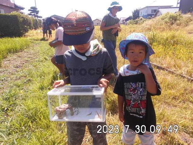 畑と田んぼのの雑草取りと合わせて、畑と田んぼに生息する生き物観察を行った後に、夏野菜の収穫を行いました。