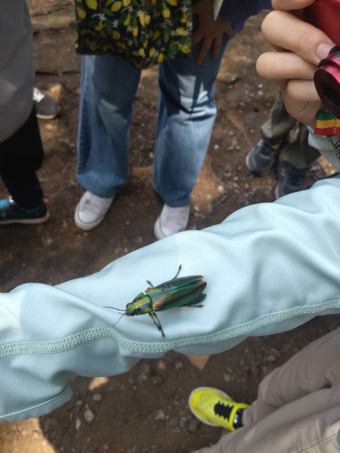 高低差のある斜面林を下ったり、上ったりしながら問題を見つけるのに元気いっぱい楽しんでいました。すぐ見つけられるもの、なかなか見つけられないレアなものもありますが、さささっとひたすらハイスピードで下りていってしまう性格もあるかなと思いました。アワフキムシはこの日、1つしかなかったのでレアでした。