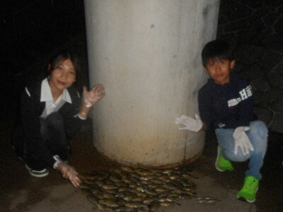 ブルーギルの未成魚~成魚76匹とオオクチバスの幼魚4匹の合計80匹が釣れて、3回の中で一番多く釣れました。えさはスジエビとフトミミズで、水の中にえさを入れたらすぐに釣れて、小田さんが釣れた魚を外してすぐにえさをつけてくれたので、回転が早くてたくさん釣れました。多い時にはブルーギルが4匹いっしょに釣れて、散歩をしていた地元の人が「こんなの見たことない!」と、驚いていたけどうれしそうでした。夢中になって釣っていたら、すぐに日がくれました。ぼくは、外来魚駆除釣りでは外来魚だけじゃなくて他の魚も釣れると思っていたけど、ブルーギルやオオクチバスしか釣れなくてびっくりしました。
