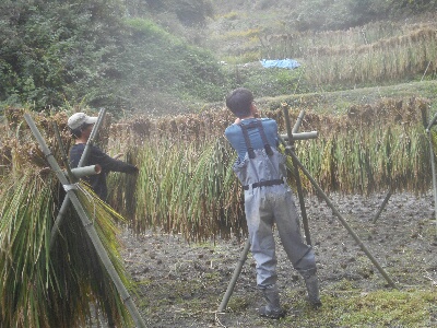 里地里山保全推進協議会の方々が守っている山の中にある棚田の稲刈りに参加させていただきました。一緒に田植えをした小学生メンバーは自然学校で来られないので少ない人数です。アクアリウムが田植えをした田んぼの稲を刈り取り、その稲を藁で結んで稲束を作り、協議会の方が伐採してくださった竹で稲架を組んで、その稲架に稲束を掛けて稲架掛けを作り天日干しにします。