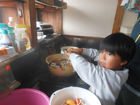 初めて干し柿づくりにチャレンジするので、ワクワクしていました。先ずは、渋柿の皮むきを行ってから、お湯を沸かして、熱湯消毒後に、軒下に処理した、渋柿を吊るしました。