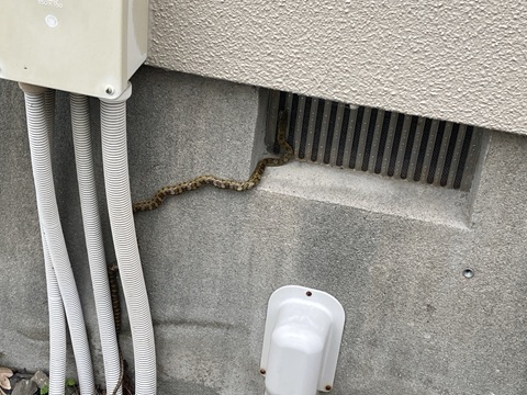 サツマイモと落花生を収穫を開始すると、隣接する隣の家の基礎部分に、蛇が居ることを発見して、めったに遭遇しない状況に、驚いて、蛇をじっくりと、観察していました。