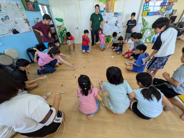 ベイブレード作り中、カッターやキリを使用する場面では、低学年には難しい部分を高学年が協力し、手伝う様子が見られました。