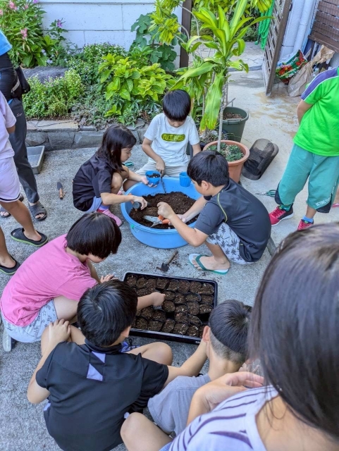 夏休みの昼食作りやおやつ作りで出た野菜くずやたまごの殻を利用して、子どもたちと一緒に堆肥づくりを行いました。