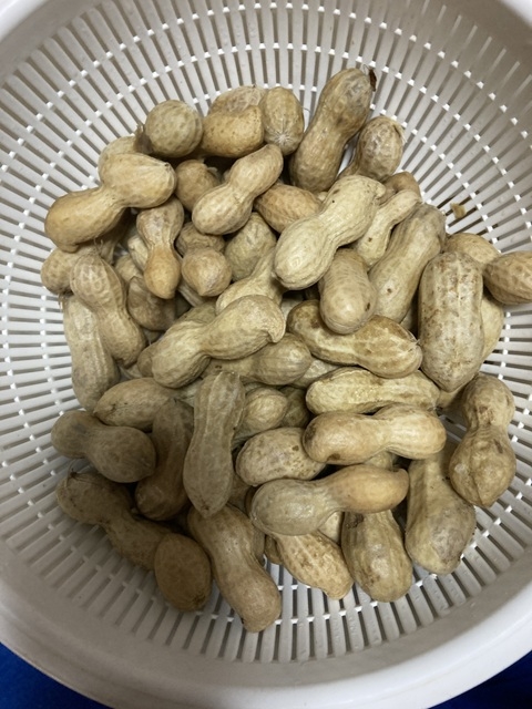 続いて、落花生の収穫も併せて行って、落花生も掛け声をかけて、地面から引き抜くと、意外に簡単に収穫できたことに驚いていました。落花生がどのように成長しているか知らなかったようで、茎から伸びた根が、地面の栄養分を吸収して、実ができている姿に驚いていました。また、沢山の実が、茎からたれ下がっている姿に、感動していました。