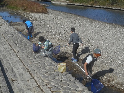 とてもたくさんの生き物がとれて、みんな調査を一生けんめいがんばっていました。河原のすみの小さな流れで魚をとっていたら、簡単にブルーギルがとれたのでおどろきました。ブルーギルは畑の肥料に、アメリカザリガニは学校で飼っているウナギのえさに持って帰りました。