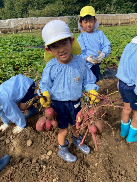 年長は、自分達で苗植え体験をしていることもあり、まず苗が畑にぐんぐん伸びていていることに驚きそして、みんなで力を合わせて苗をたどって掘った畑の中にお芋ができていることに感動して、たくさんの歓声が上がっていました。