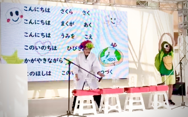 プラごみを食べて苦しんでいるウミガメとウミガメの命を救う海洋生物博士の物語をユニークな劇にして発表しました。劇の最後にペットボトルのごみで作った『ぺっ琴』という楽器を使って、博士は大阪・関西万博のテーマソング「この地球の続きを」演奏し、ウミガメは博士の演奏に合わせて踊りました。その後、毎月大阪海さくらさんと行っている淀川のごみひろいの活動について、パワーポイントを使って説明しました。こどもエコクラブのこども達や観客のみなさんは、大きな声で笑ってくれたり、大きく頷きながら聞いてくれたりしました。大屋根リングの上からも多くの方が見てくださり、大きな拍手に包まれました。