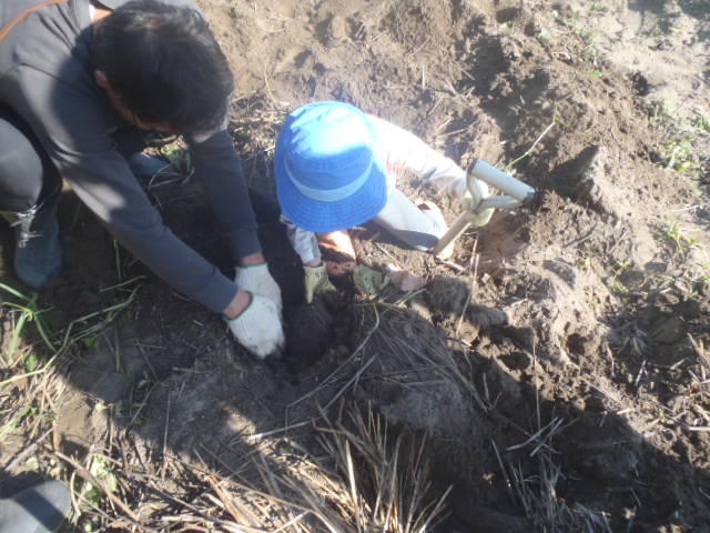 サツマイモと落花生を育てるために、活動で育てている稲藁・麦藁を活用していますので、藁の下には、沢山の生物が生息していることに、驚いていました。但し、ムカデを発見すると、大声で危ないと、声掛けを行っていました。