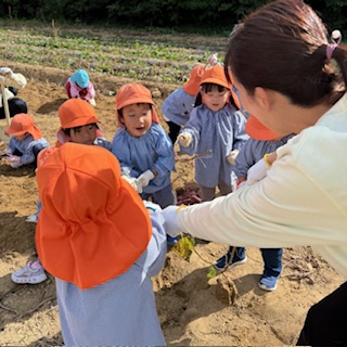 園では栽培活動もプランターになるため、畑での芋掘り体験は大変貴重な体験となりました。地中深くに埋まっている芋を掘る経験や、優しく土を掘っていかないと、下の芋が掘り出せないなど色々な経験や学ぶ機会となった。