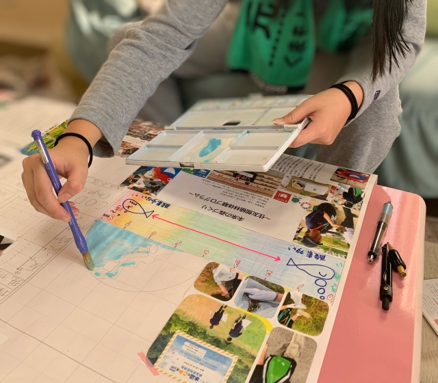 農業や水、産業、環境学習など大きな区分で区切りました。グラフや表は読みやすく、小さな文字は文字のフォントでなるべく読みやすくなるような工夫をしました。ノート書きで計画を立て、大きな縦書き模造紙のサイズに移していき、約2週間で仕上げました。