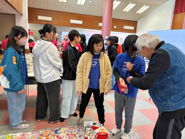 新聞紙バッグの参加者が少なかったので、見本をわかりやすく飾っておくとよかったです。いろいろな人からのアイディアや自分の意見なども含めて、来年に向けての課題が見つかりました。接客の楽しさと大変さが分かりました。楽しかったです。(メンバー)