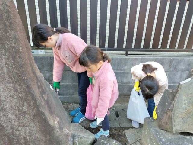 三人でゴミを見つけると競い合って拾っていました。