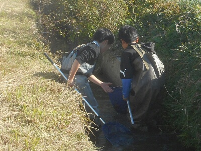 明石川とつながっている平野大池の用水路で場所を変えながら調査をしました。1時間30分で、ミナミメダカの成魚約90匹、オイカワの幼魚~未成魚約60匹、モツゴの幼魚~未成魚7匹、タモロコの未成魚4匹、ギンブナの未成魚5匹、コイの幼魚1匹、コイとフナの交雑のコイフナの未成魚1匹、カワリヌマエビ属の幼体~成体約230匹、テナガエビの幼体~成体約70匹、スジエビの未成体~成体約10匹、ギンヤンマの幼虫1匹、ヒメガムシの成虫1匹がとれました。
