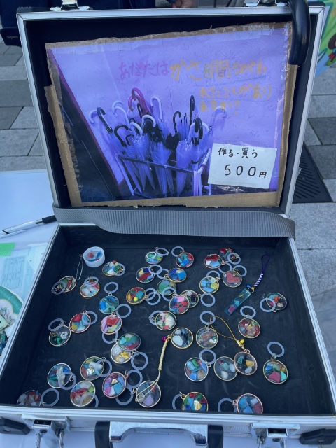 僕たちは2024年12月1日、三宮駅前のサンキタ広場で、活動拠点である大阪湾近くの中洲である中之島や大阪湾、また、兵庫県近海の砂浜で拾い集めた海洋プラスチックゴミを活用して、活動の中心である「アンブレラチャーム」のワークショップと販売しました。