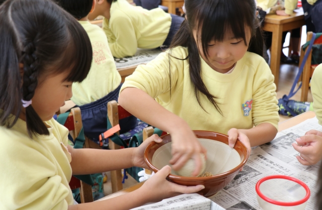 初めて行う活動で、最初は力の入れ具合や要領が良く分からず苦戦してましたが、経験して要領が分かってくると牛乳パックの中で稲穂から籾が採れてパラパラと落ちる音だったり、すり鉢のゴリゴリする感触を味わったり、すっかり熱中して楽しんでいる様子でした。