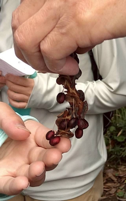 暑さもやわらぎ、やっとゆっくり散策出来ると楽しそうでした。でもなんと夏にはいなかった蚊が大発生!久しぶりのごちそうがやって来たとばかりに、まとわりつかれてまいりました。下見で巣は無いことは確認していましたが、スズメバチも大好きな樹液の出る木で食事中でしたので、そのルートは避けました。それでも小さい実やひっつきむしの種を見つけるのに、じっくり目をこらしながら「あったぁ」「一番早く見つけた」と声が上がっていました。虫や生き物を見つけるとみんなに知らせてくれるメンバーもいました。