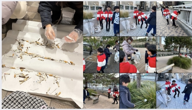 参加した子どもたちは、寒い冬の朝にもかかわらず、毎日自分から進んで集合し、ラジオ体操や清掃活動に取り組んでいました。ゴミを見つけると「こんな所にもある」「またタバコや」と声を掛け合いながら、協力して拾う姿が見られました。特にタバコの吸い殻については、植え込みの奥や草の中に隠れるように捨てられているものも多く、しゃがみこんで探すなど、根気強く活動する様子が印象的でした。本数を数える際には、「こんなに多いと思わなかった」「少しずつでも減らしたい」といった声が上がり、環境問題を自分ごととして捉え始めている様子が感じられました。