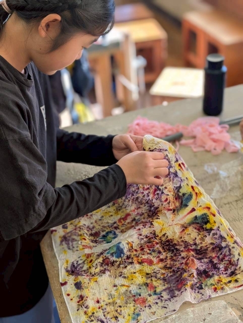 草木染めは毎年色々と経験をしてきました。1枚のハンカチにこんなにたくさんの色があるのは初めてで、子供たちは絵を描くようにバランスを考えながら配置していました。蒸して色をつけることも初めてでした。いろいろな技法があることを感じることができました。