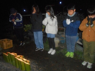 朝、早起きしてナーセリーに集まって、明石川で竹を切って作った竹灯明台に火を灯して、震災があった5時46分に亡くなった人たちに手を合わせてもくとうしました。