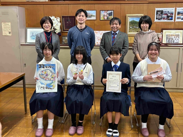 メンバー3名が表彰式の進行と、賞状・賞品の授与を行いました。受賞者も中学生でメンバーと同学年ということで、あまり緊張していなかった様子でした。式はスムーズに進行し、最後の作品をお返しするところまで、予定通りしっかりとできていました。受賞者の方と校長先生からのコメントをいただいて、記念撮影をして、無事式が終わり最後はほっとした表情でした。