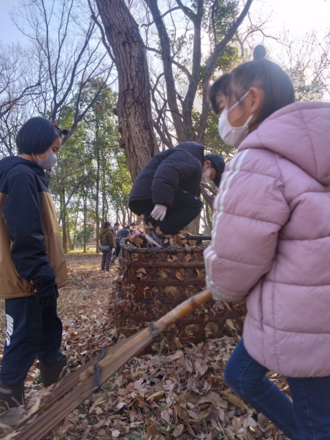 子どもたちは落ち葉はきが大好きです。冬の平地林とは思えない熱気です。体もぽかぽかと温まってきます。自分たちが取りかかった籠がいっぱいになるように競争です。中に入った人と周りに落ち葉を集めてくるチームワークも重要です。そのうち他の籠のメンバーとも協力し合いながら、何籠もいっぱいにしていく達成感で満足そうでした。