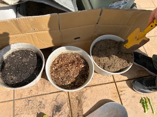 3種類のコンポスト、キエーロと竹チップコンポスト、ヒノキチップコンポストに大根の葉を入れました。次回変化の違いを観察する予定です。ヒノキチップコンポストは初めて作成しました。ビオラが元気がなかったので植え替えました。、竹チップとヒノキチップ、竹チップと土、ヒノキチップと土を植木鉢に入れて、それぞれの変化をみることにしました。