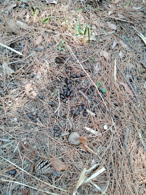 その後、群馬県森林インストラクター協会の方々とフィールドで実際に鹿の痕跡などを探しました。竹林の近くにたくさんの鹿のフンを見つけました。また、イノシシが泥浴びをした痕跡や毛なども発見しました。どうやら竹林にも鹿やイノシシが多く出没しているようです。
