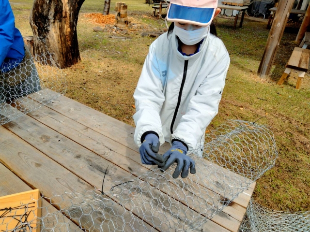 鹿からタケノコを守るため、金網を筒状にしてタケノコに被せる防護筒を作成しました。