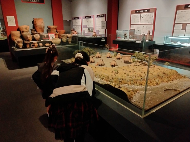 縄文時代の遺跡が見つかった場所の近くに作られた施設で、発掘された土器や石器、当時の住居を再現したものなどを見学しました。