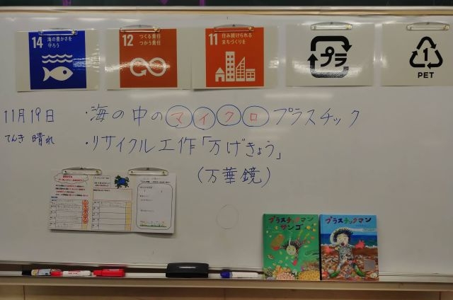 絵本『プラスチックマンとサンゴ』を読んだ後、実物のマイクロプラスチックを見ました。また捨てられたゴミがどのようにして海まで行きつくのか?海に漂うレジ袋やマイクロプラスチックが生きものにどんな影響を与えているのか?について学習しました。