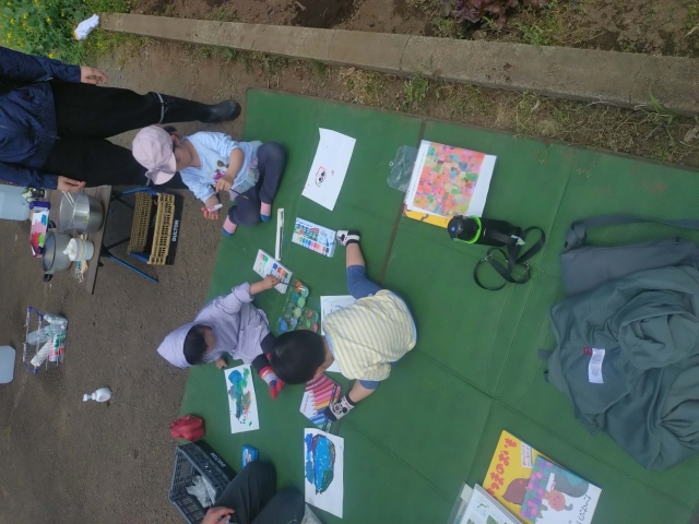絵具を使って思いっきり青空の下で絵をかきました。