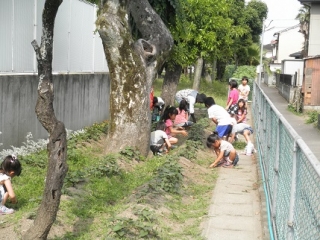 手で雑草を根っこから抜きましたが、取りにくい雑草は、スコップで堀り抜きました。 学年で競争をして草取りをしましたが、競争となると張り切って頑張りました。