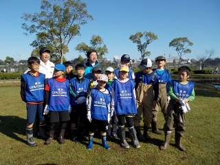 市民ビオトープ造成日当日、私たち逆川こどもエコクラブは参加の子供代表として、市長さんの後にごあいさつを行いました。参加者は約120人、逆川こどもエコクラブからはメンバー18人、サポーター25人が参加しました。クラブの代表の人たちは、胴長ぐつをはいて準備OKです。いざ出発!