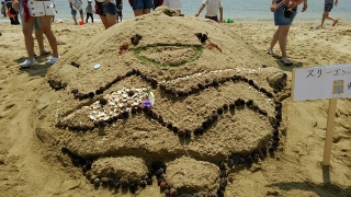 その後、みんなで力を合わせて砂の造形をしました。須磨区のキャラクター、「すまぼう」を作り、松ぼっくりや貝殻や海藻を集めて飾りました。