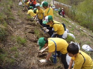 植樹には、苗木・土・水を持って、急な斜面を登り樹を植えます。メンバーにはきつい作業でしたが頑張って植樹することができました。