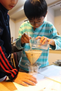 水に石鹸を溶かし、インクを入れ、鉛筆の削りかす、砂も入れたどろどろの水が、段階を踏むことで少しずつろ過されきれいになっていく様子を観察し驚いていた。