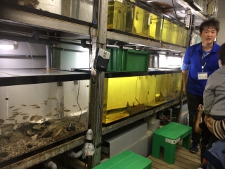 表に展示している魚だけでなく、中で飼育してる魚がたくさんいることに驚いていました。スタッフの方から、病気の魚にゆっくり休んでまもらったりするためにここで過ごしてるということを教えてもらいました。また、水槽が黄色の水がたくさんあるのは、薬を飲むことができないから、水に薬を溶かして良くなるようにしてると教えてもらい驚いてました。