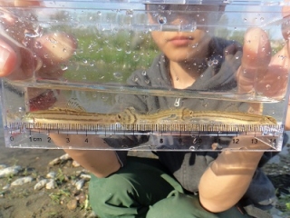 調査のあとで、しかけのカゴの設置の練習をしました。しかけのえさには、アクアリウムが前に駆除をしたブルーギルの冷凍を使って、においが出るように、おなかのところをはさみで切りました。そして川の中の草のしげみがあるところに4つ設置しました。これから協働防除活動や学校の川探検で、しかけのカゴをしかけることがふえるので、その練習です。調査は40分で、オイカワの幼魚150匹、カマツカの幼魚~若魚9匹、チュウガタスジシマドジョウの幼魚~若魚6匹、ドジョウの成魚1匹、ゲンゴロウブナの老成魚1匹、モツゴの幼魚1匹、ミナミヌマエビ110匹、スジエビ12匹、ハグロトンボの幼虫16匹、イトトンボの幼虫2匹、サナエトンボの幼虫1匹がとれました。ぜんぶリリースしました。