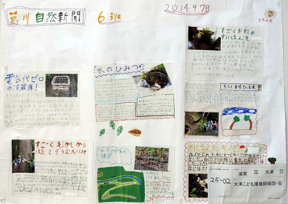 かべ新聞のタイトルと応募用紙の不整合がありますね。「葛川新聞」と「葛川自然新聞」とでは,記事をのせるはんいも大きくことなってくるのではないでしょうか。その上,かべ新聞の6班以外のかべ新聞を見たいものです。それと「宿泊体験」~「これ見て!私が見つけた自然の姿」という活動のテーマがかべ新聞に記載されていないことや,あまりこだわりませんが着眼点やまとめ方に不ぞろいの印象があります。書き直せばいいだけのことです。参加者が多数いるので,着眼点とまとめ方の字体や大きさがそろわないときは,思い切って書き直しをするととてもきれいになると思います。