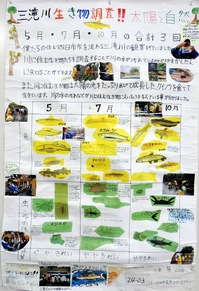 一番下にきれいな海にしよう!!ごみの調査もしました。CO2を少なくしよう。と書いてあります。三滝川の生きもの調査から、とつぜん、海の話、ごみの話、CO2の話が書いてあるので、つながりが分かりません。チアーズクラブのこどもたちとは、よく話し合ったことだと思いますが、ぜひ、つながりが分かるようにして下さい。