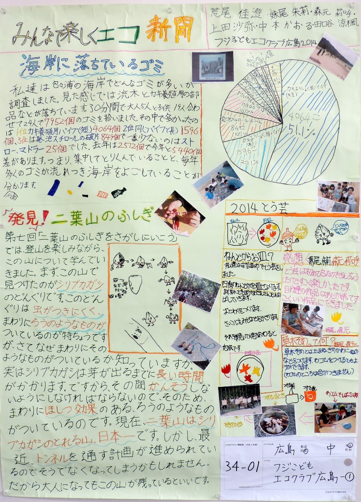 見出しが大きくカラフルで、何について書かれているのかがわかりやすく、何枚も写真をはってくれているので活動の様子も伝わってきますね。ほとんどの人が陶芸を初めて体験したとのことですが、みなさんどんな反応でしたか?たとえば粘土のかたさは想像していたものとちがいはありましたか?きっとたくさんの感想や発見があったことと思います。ふだんではなかなかできない体験を「フジこどもエコクラブ広島」の活動でできたことは良い思い出となったことでしょう。