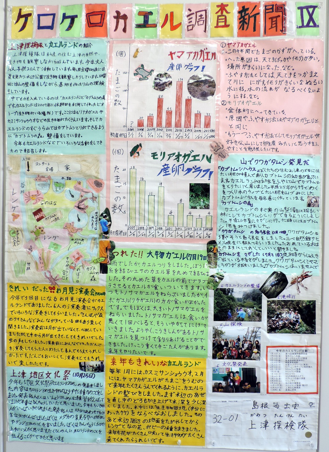 新聞中央下にカエルランドの活動が載っていますが,なんと合計49回に達しています。それと新聞の下の方に,きちんと文化祭で発表する姿がレポートされているのはすばらしいことです。成果を発表していろんな人に知ってもらうのは大切なことです。特にヤマアカガエルとモリアオガエルの初産卵日と卵のかたまりの数を9年間も数えているのはすばらしいことです。また,卵のかたまりの数が減ってきていることを見つけ,天敵のせいではないかと推測しています。さらに卵を増やすためには,天敵を捕まえて川に逃がすことやイモリが嫌いなぬるい水にすることだと方策についても考えています。