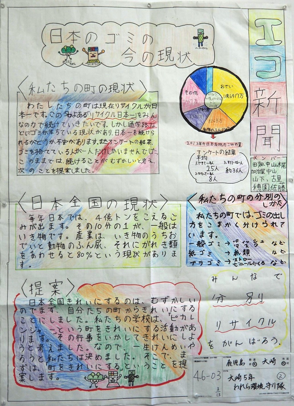 色や図を上手く使って見やすい壁新聞を作ることができましたね。大崎町のリサイクル率が日本一というのは、初めて知りました。住民のみなさんが協力しないと実現できないことです。ごみの分別の仕方が細かいことが、壁新聞にも書かれています。普段みなさんが取り組んでいて、分別はむずかしいですか?慣れればむずかしくないものでしょうか。他の地域でもそういった取り組みが広がるといいなと思いました。