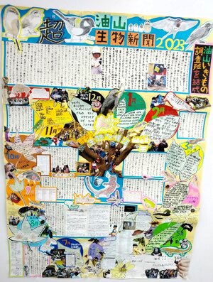 この壁新聞について、まずはいきいきと描かれた生き物の絵があちこちにていねいに書かれていて、とても驚きました。真剣にそして楽しみながら取組んだことが伝わってきました。また大木に登ってみんなが写っている写真は、「生物多様性」をテーマにした活動写真としてとてもいいシンボル写真になっていますね。とてもにぎやかで、ワクワクした気持ちで新聞を読ませてもらいました。